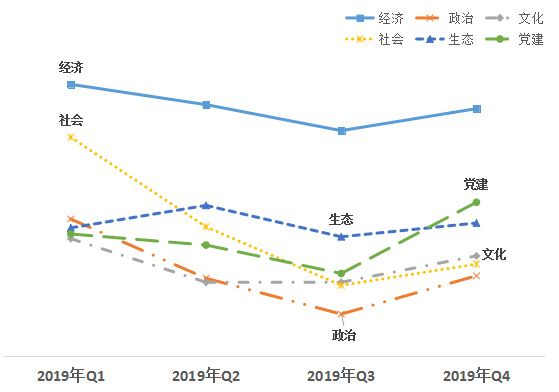 從六大領(lǐng)域來看,經(jīng)濟(jì)領(lǐng)域得分78.41,政治領(lǐng)域得分65.95,文化領(lǐng)域得分67.43,社會領(lǐng)域得分66.82,生態(tài)領(lǐng)域得分69.89,黨建領(lǐng)域得分71.43。經(jīng)濟(jì)領(lǐng)域改革熱度值仍居首位,黨建領(lǐng)域名列第二,生態(tài)領(lǐng)域超越文化、社會領(lǐng)域,位于第三;與三季度相比,六大領(lǐng)域均有明顯提升,其中黨建領(lǐng)域增加最多;