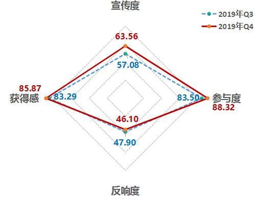 4、從維度來看,參與度、反響度有所下降,獲得感明顯提升。第四季度,宣傳度得分63.56,參與度得分88.32,反響度得分46.10,獲得感得分85.87。