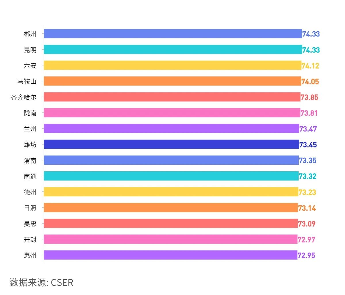 天津74.75,重慶74.5,濟(jì)南73.8,西安73.15,青島73.03,成都72.56,上海72.5,深圳72.19,沈陽71.87,杭州70.71,北京70.5,長春70.43,廣州69.36,寧波69.07,武漢69.02,哈爾濱68.48,大連67.34,南京66.81,廈門64.32。