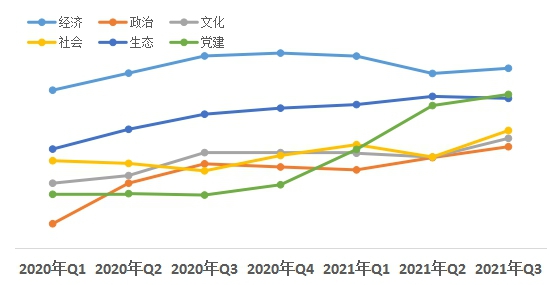 從近幾個(gè)季度的評(píng)估結(jié)果來(lái)看,經(jīng)濟(jì)領(lǐng)域熱度值領(lǐng)先其他領(lǐng)域;黨建領(lǐng)域熱度值從2020年第三季度開(kāi)始穩(wěn)步上升,且增幅高于文化、社會(huì)等領(lǐng)域;政治領(lǐng)域改革熱度值從今年一季度以來(lái)持續(xù)呈上升趨勢(shì)。