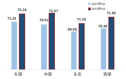 2、從區(qū)域來(lái)看,西部、中部地區(qū)熱度指數(shù)增長(zhǎng)明顯。東、中、東北、西部改革熱度指數(shù)分別為72.26、72.37、71.02、71.85。中部地區(qū)超越東部地區(qū)位列第一,西部地區(qū)超越東北地區(qū)位居第三,東北地區(qū)最后。四大區(qū)域均比上一季度有所上升。其中,西部、中部地區(qū)的增幅較大。
