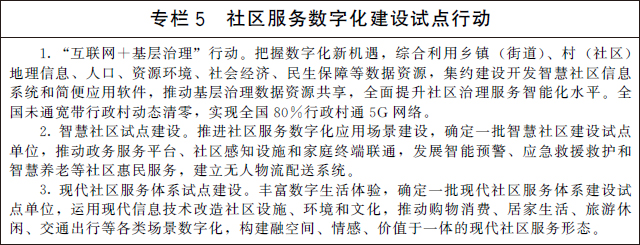 開發(fā)社區(qū)協(xié)商議事、政務(wù)服務(wù)辦理、養(yǎng)老、家政、衛(wèi)生、托育等網(wǎng)上服務(wù)項目應(yīng)用,推動社區(qū)物業(yè)設(shè)備設(shè)施、安防等智能化改造升級。集約建設(shè)智慧社區(qū)信息系統(tǒng),開發(fā)智慧社區(qū)移動應(yīng)用服務(wù),加速線上線下融合。推進數(shù)字社區(qū)服務(wù)圈、智慧家庭建設(shè),促進社區(qū)家庭聯(lián)動智慧服務(wù)生活圈發(fā)展。大力發(fā)展社區(qū)電子商務(wù),探索推動無人物流配送進社區(qū)。推動“互聯(lián)網(wǎng)+”與社區(qū)服務(wù)的深度融合,逐步構(gòu)建服務(wù)便捷、管理精細(xì)、設(shè)施智能、環(huán)境宜居、私密安全的智慧社區(qū)。以縣(市、區(qū)、旗)為單位,支持利用互聯(lián)網(wǎng)、物聯(lián)網(wǎng)、區(qū)塊鏈等現(xiàn)代信息技術(shù),深入組織開展智慧社區(qū)、現(xiàn)代社區(qū)服務(wù)體系試點建設(shè),高效匹配社區(qū)全生活鏈供需,擴大多層次便利化社會服務(wù)供給。鼓勵社會資本投資建設(shè)智慧社區(qū),運用第五代移動通信(5G)、物聯(lián)網(wǎng)等現(xiàn)代信息技術(shù)推進智慧社區(qū)信息基礎(chǔ)設(shè)施建設(shè)。