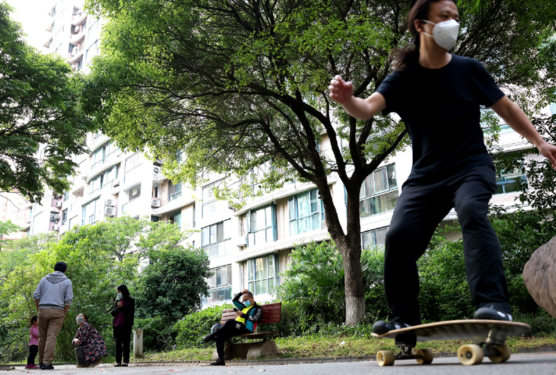 5月17日,市民在上海市普陀區(qū)的一個居民小區(qū)內享受休閑一刻。新華社記者 陳飛 攝