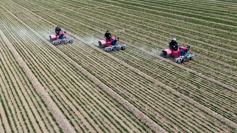 2月17日,在山東省聊城市莘縣妹冢鎮(zhèn),農民在麥田里進行鎮(zhèn)壓保墑作業(yè)(無人機照片)。新華社記者 郭緒雷 攝