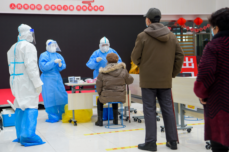 在內蒙古滿洲里市東山街道辦事處怡園社區(qū)府欣小區(qū)A區(qū)核酸采樣點,工作人員為居民做核酸采樣(2021年11月29日攝)。新華社記者 李志鵬 攝