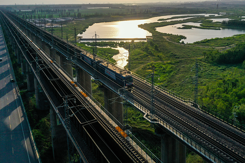 重載列車(chē)行駛在大秦鐵路上(2022年7月16日攝,無(wú)人機(jī)照片)。為做好迎峰度夏能源保供工作,中國(guó)鐵路太原局集團(tuán)有限公司在確保運(yùn)輸安全的前提下全力提升煤炭運(yùn)量。新華社記者 曹陽(yáng) 攝