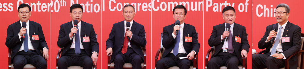 10月20日,中國共產(chǎn)黨第二十次全國代表大會新聞中心舉行集體采訪。青海、寧夏、新疆、中央和國家機關(guān)、中央金融系統(tǒng)、中央企業(yè)系統(tǒng)(在京)代表團新聞發(fā)言人出席,介紹代表團學(xué)習(xí)討論二十大報告情況,并回答記者提問(拼版照片)。新華社記者 張玉薇 攝
