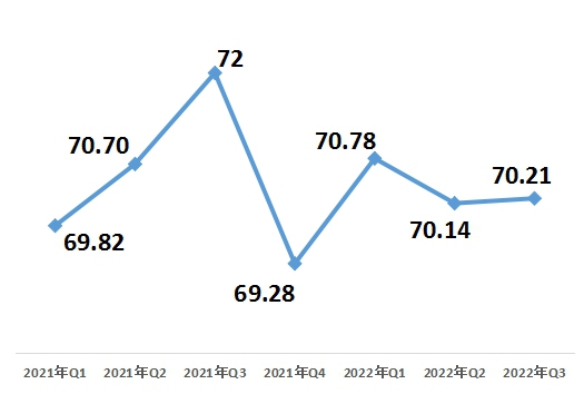 3、從城市群來(lái)看,長(zhǎng)三角城市群連續(xù)兩個(gè)季度下降。三大城市群綜合指數(shù)70.65,其中,京津冀地區(qū)71.03,粵港澳大灣區(qū)(不含港澳)71.17,略高于三大城市群綜合指數(shù);長(zhǎng)三角城市群69.76,略低于三大城市群綜合指數(shù)。