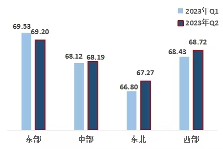 3、東部地區(qū)改革熱度指數(shù)下降,西部地區(qū)超越中部地區(qū)。東部、西部、中部、東北地區(qū)指數(shù)分別為69.20、68.72、68.19、67.27。東部地區(qū)領(lǐng)先,西部地區(qū)排名第二,且連續(xù)五個季度超越中部地區(qū),東北地區(qū)最后。與上一季度相比,中部、東北、西部地區(qū)改革熱度指數(shù)有所上升。