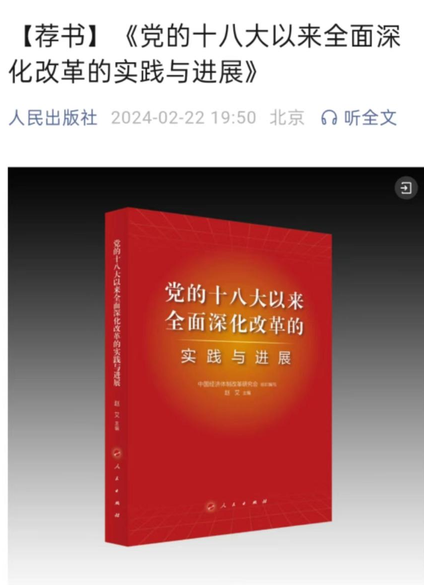 2024年2月22日,由我會(huì)組織編寫(xiě),會(huì)長(zhǎng)彭森作序、常務(wù)副會(huì)長(zhǎng)兼秘書(shū)長(zhǎng)趙艾主編的《黨的十八大以來(lái)全面深化改革的實(shí)踐與進(jìn)展》一書(shū),入選人民出版社官方微信公眾號(hào)[薦書(shū)]欄目,成為人民出版社推薦的新書(shū)。