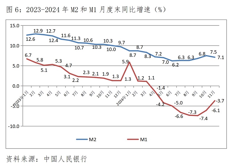 (四)M2增速由升轉(zhuǎn)落。11月末,廣義貨幣供應(yīng)量(M2)同比增長(zhǎng)7.1%,比10月末增長(zhǎng)7.5%回落0.4個(gè)百分點(diǎn),10月末增速比9月末增速回升0.7個(gè)百分點(diǎn);狹義貨幣供應(yīng)量(M1)降幅繼續(xù)縮小,11月末同比下降3.7%,比10月末同比下降6.1%縮小2.4個(gè)百分點(diǎn),10月末降幅比9月末降幅縮小1.3個(gè)百分點(diǎn);流通中貨幣(M0)增速由升轉(zhuǎn)落,11月末同比增長(zhǎng)12.7%,比10月末增長(zhǎng)12.8%回落0.1介百分點(diǎn),10月末增速比9月末增速回升了1.3個(gè)百分點(diǎn)。各層次貨幣供應(yīng)量又出現(xiàn)了不同方向的變化走勢(shì)。