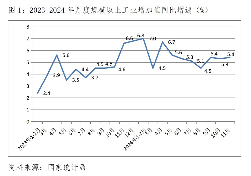 (一)工業(yè)增速由落轉(zhuǎn)升。11月份,規(guī)模以上工業(yè)增加值同比增長(zhǎng)5.4%,比10月份增長(zhǎng)5.3%回升了0.1個(gè)百分點(diǎn),10月份增速比9月份增速5.4%回落了0.1個(gè)百分點(diǎn)。其中,制造業(yè)同比增長(zhǎng)6.0%,比上月回升0.6個(gè)百分點(diǎn);國(guó)有控股企業(yè)增長(zhǎng)3.9%,回升0.1個(gè)百分點(diǎn);私營(yíng)企業(yè)增長(zhǎng)4.5%,回落0.3個(gè)百分點(diǎn)。
