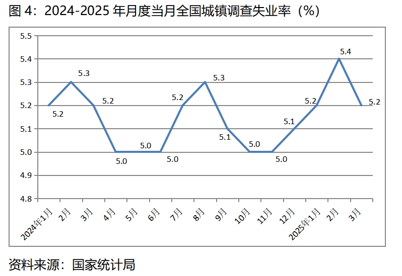 (三)調(diào)查失業(yè)率比上年四季度和上年同期均略有回升。一季度平均調(diào)查失業(yè)率為5.3%,比上年四季度的5.0%回升0.3個百分點,比上年同期的5.2%回升了0.1個百分點,其中1月份為5.2%,2月份為5.4%,3月份為5.2%,總體上保持了基本穩(wěn)定的態(tài)勢。