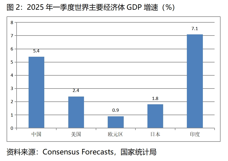 5.4%的經(jīng)濟(jì)增速在世界上是比較快的增速。根據(jù)Consensus Forecasts 最新預(yù)測數(shù)據(jù),今年一季度美國GDP同比增長2.4%,歐元區(qū)增長0.9%,日本增長1.8%,印度增長7.1%,我國仍然是世界主要經(jīng)濟(jì)體中經(jīng)濟(jì)增長比較快的國家。
