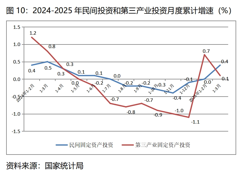 (一)民間投資和第三產(chǎn)業(yè)投資增長仍比較緩慢,增速比上年全年和上年同期均變化不大。一季度民間固定資產(chǎn)投資同比增長0.4%,上年全年為下降0.1%,比上年同期增長0.5%回落0.1個百分點;一季度第三產(chǎn)業(yè)固定資產(chǎn)投資同比增長0.1%,上年全年為下降1.1%,比上年同期增長0.8%回落0.7個百分點。這說明民營經(jīng)濟(jì)和第三產(chǎn)業(yè)生產(chǎn)經(jīng)營活力還比較弱。