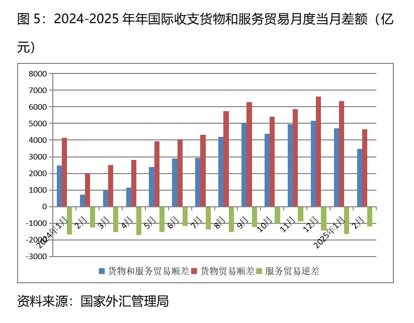 (四)國際收支貨物和服務(wù)貿(mào)易順差增加。今年1月份國際收支貨物和服務(wù)貿(mào)易順差4711億元,比上年同月的2459億元增加2252億元;2月份順差3459億元,比上年同月的724億元增加2735億元,國際收支貨物和服務(wù)貿(mào)易繼續(xù)保持多年以來順差的態(tài)勢,同時今年以來的順差比上年同期增加較多。國際收支貨物和服務(wù)順差中,貨物貿(mào)易繼續(xù)保持順差,服務(wù)貿(mào)易仍然保持逆差。1月份國際收支貨物貿(mào)易順差6342億元,服務(wù)貿(mào)易逆差1631億元;2月份國際收支貨物貿(mào)易順差4638億元,服務(wù)貿(mào)易逆差1178億元。在國際環(huán)境趨于更加復(fù)雜嚴(yán)峻形勢下,國際收支貨物和服務(wù)貿(mào)易仍實現(xiàn)較大順差,充分說明我國經(jīng)濟(jì)有著較強的韌性和回旋空間。