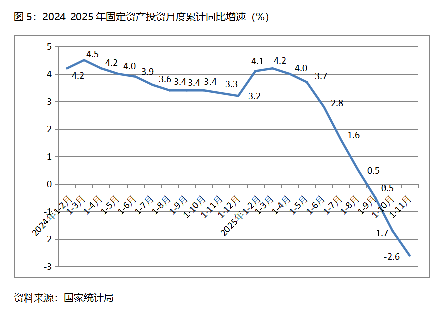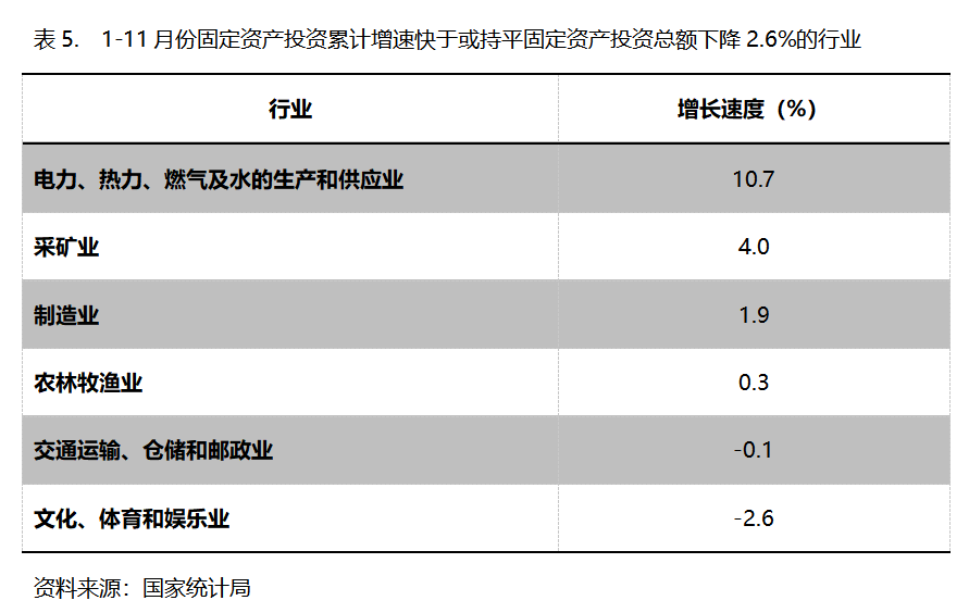 1-11月份,固定資產(chǎn)投資累計(jì)增速快于或持平固定資產(chǎn)投資總額下降2.6%的行業(yè)共6個(gè),即電力、熱力、燃?xì)饧八纳a(chǎn)和供應(yīng)業(yè)增長10.7%,采礦業(yè)增長4.0%,制造業(yè)增長1.9%。農(nóng)林牧漁業(yè)增長0.3%,交通運(yùn)輸、倉儲(chǔ)和郵政業(yè)下降0.1%,文化、體育和娛樂業(yè)下降2.6%。