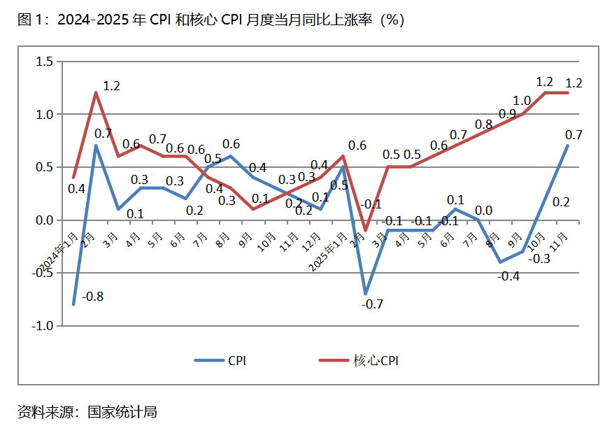 一、CPI漲幅持續(xù)回升。11月份,CPI同比上漲0.7%,比10月份上漲0.2%回升0.5個(gè)百分點(diǎn),10月份由9月份下降0.3%轉(zhuǎn)為上漲;核心CPI同比上漲1.2%,與10月份上漲1.2%持平,10月份比9月份上漲1.0%回升了0.2個(gè)百分點(diǎn)。CPI漲幅回升較為為明顯,核心CPI漲幅保持穩(wěn)定,表明經(jīng)濟(jì)運(yùn)行活力繼續(xù)增強(qiáng),但由于漲幅仍較為有限,加之較長時(shí)期處于偏低水平,經(jīng)濟(jì)運(yùn)行活力還有待進(jìn)一步提高。