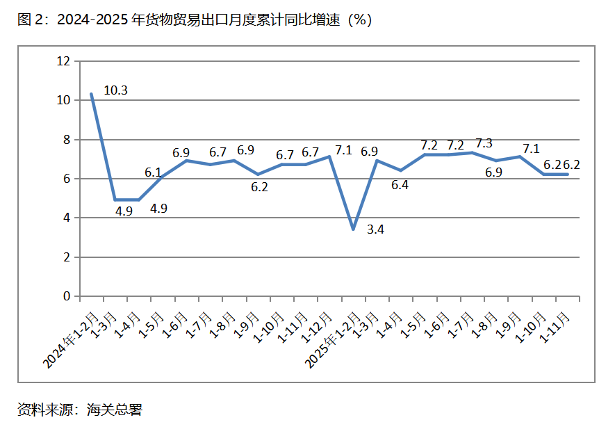 二、出口增速由落轉(zhuǎn)平。1-11月份,貨物出口同比增長6.2%,與1-10月份增長6.2%持平,1-10月份比1-9月份增長7.1%回落0.9個(gè)百分點(diǎn)。貨物出口對主要貿(mào)易出口經(jīng)濟(jì)體增速有升有落有平,1-11月份對歐盟出口同比增長8.9%,比1-10月份對歐盟出口同比增長8.4%回升0.5個(gè)百分點(diǎn);對美國出口下降18.3%,比1-10月份下降17.1%擴(kuò)大1.2個(gè)百分點(diǎn);對東盟出口增長14.6%,比1-10月份增長15.3%回落0.7個(gè)百分點(diǎn);對拉丁美洲出口增長7.9%,比1-10月份增長7.3%回升0.6個(gè)百分點(diǎn);對非洲出口增長27.2%,與1-10月份增長27.2%持平。貨物出口在跌宕起伏的國際形勢下仍保持穩(wěn)定增長,彰顯出我國對外貿(mào)易的較強(qiáng)韌性。