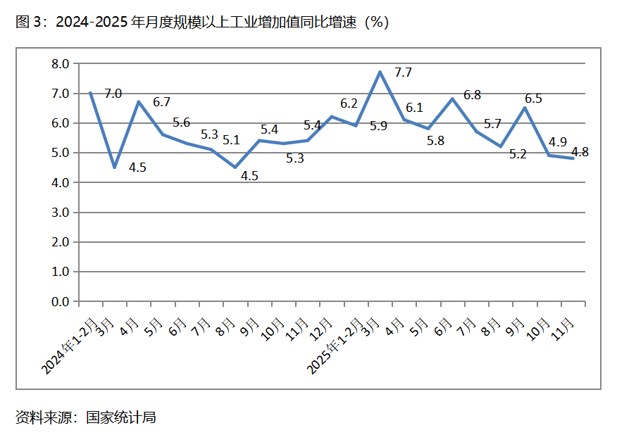 三、工業(yè)增速持續(xù)回落。11月份,規(guī)模以上工業(yè)增加值同比增長4.8%,比10月份增長4.9%回落了0.1個(gè)百分點(diǎn),10月份比9月份增長6.5%回落了1.6個(gè)百分點(diǎn)。從工業(yè)三大門類看,采礦業(yè)增速比上月回升,制造業(yè)和電力、熱力、燃?xì)饧八a(chǎn)和供應(yīng)業(yè)增速回落,11月份,采礦業(yè)同比增長6.3%,比上月增長4.5%回升1.8個(gè)百分點(diǎn);制造業(yè)增長4.6%,比上月增長4.9%回落0.3個(gè)百分點(diǎn);電力、熱力、燃?xì)饧八a(chǎn)和供應(yīng)業(yè)增長4.3%,比上月增長5.4回落1.1個(gè)百分點(diǎn)。