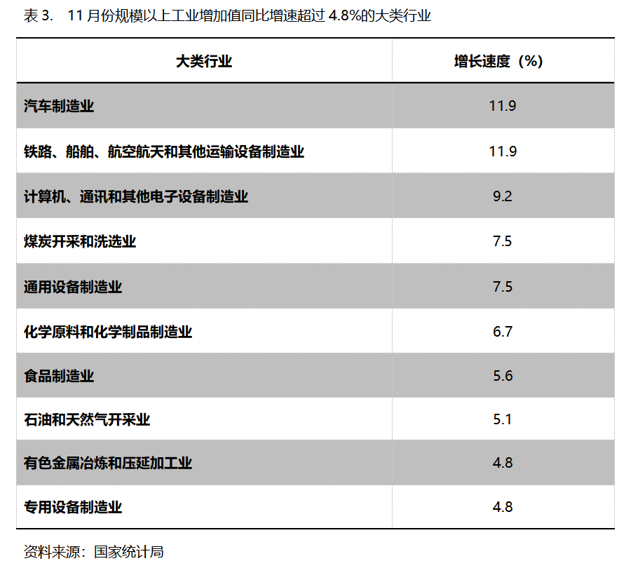 11月份,增長速度超過或持平規(guī)模以上工業(yè)增長4.8%的主要大類行業(yè)共有10個(gè),即汽車制造業(yè)同比增長11.9%,鐵路、船舶、航空航天和其他運(yùn)輸設(shè)備制造業(yè)增長11.9%,計(jì)算機(jī)、通訊和其他電子設(shè)備制造業(yè)增長9.2%,煤炭開采和洗選業(yè)增長7.5%,通用設(shè)備制造業(yè)增長7.5%,化學(xué)原料和化學(xué)制品制造業(yè)增長6.7%,食品制造業(yè)增長5.6%,石油和天然氣開采業(yè)增長5.1%,有色金屬冶煉和壓延加工業(yè)增長4.8%,專用設(shè)備制造業(yè)增長4.8%。
