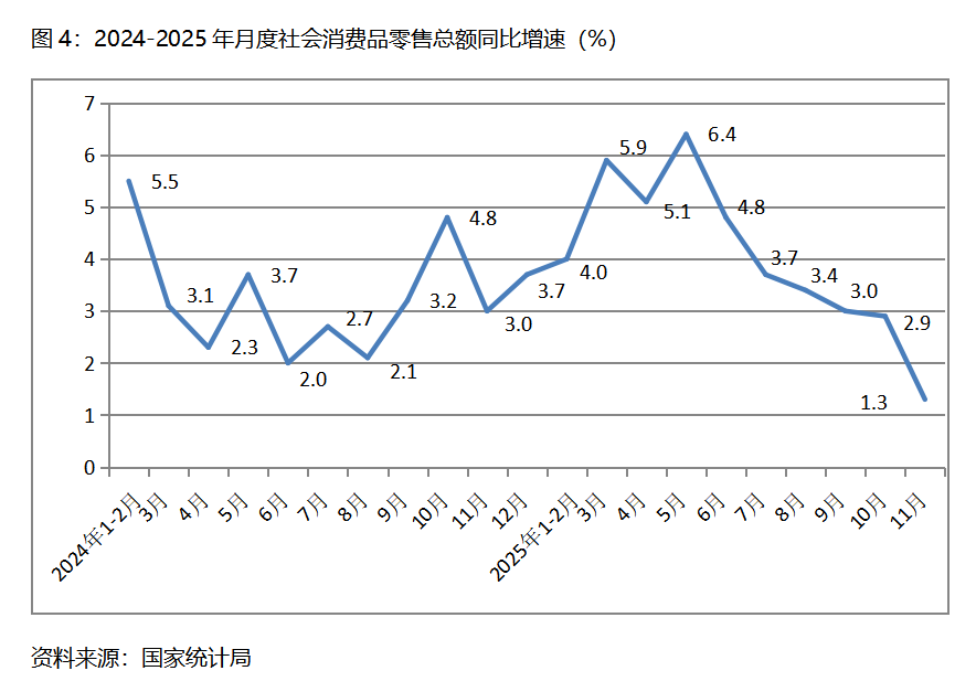 四、零售增速持續(xù)回落。11月份,社會(huì)消費(fèi)品零售總額同比增長1.3%,比10月份增長2.9%回落了1.6個(gè)百分點(diǎn),10月份比9月份增長3.0%回落了0.1個(gè)百分點(diǎn),其中,餐飲收入和商品零售額增速均出現(xiàn)了回落,10月份餐飲收入同比增長3.2%,比10月份增長3.8%回落了0.6個(gè)百分點(diǎn);商品零售額增長1.0%,比10月份增長2.8%回落1.8個(gè)百分點(diǎn)。社會(huì)消費(fèi)品零售總額增速的持續(xù)回落,需要引起高度關(guān)注。