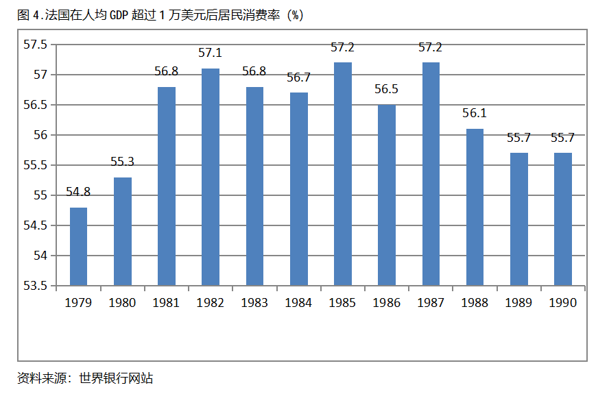 法國在人均GDP超過1萬美元后的12年期間,居民消費率一直保持在54.0%以上,同時也呈現(xiàn)出先提高后回落總體穩(wěn)定的趨勢。法國在1979年人均GDP超過1萬美元,當年居民消費率為54.8%,1985提高到57.2%,隨后又有所回落,1990年為55.7%,也就是說,法國在人均GDP超過1萬美元后的12年期間,居民消費率由當年的54.8%提高到1985年最高的57.2%,共提高了2.4個百分點。