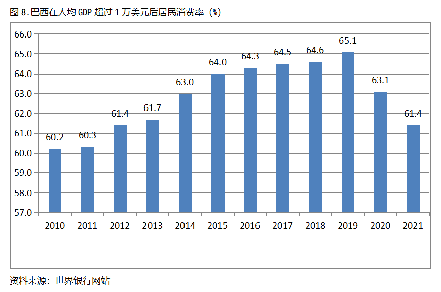 巴西在人均GDP超過1萬美元后的12年期間,居民消費率基本上保持在60.0%以上,也呈現(xiàn)出較長時間的提高,但后兩年也出現(xiàn)小幅的回落。巴西在2010年人均GDP超過1萬美元,當年居民消費率為60.2%,2019提高到65.1%,隨后兩年出現(xiàn)回落,2021年為61.4%,也就是說,巴西在人均GDP超過1萬美元后的12年期間,居民消費率由當年的60.2%提高到2019年最高的65.1%,共提高了4.9個百分點。