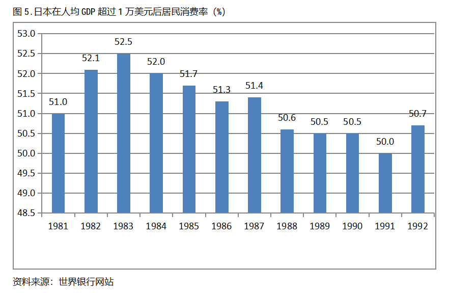 日本在人均GDP超過1萬美元后的12年期間,居民消費率一直保持在50.0%以上,同時也呈現(xiàn)出先提高后回落總體穩(wěn)定的趨勢。日本在1981年人均GDP超過1萬美元,當年居民消費率為51.0%,1983提高到52.5%,隨后又有所回落,1992年為50.7%,也就是說,日本在人均GDP超過1萬美元后的12年期間,居民消費率由當年的51.0%提高到1983年最高的52.5%,共提高了1.5個百分點。