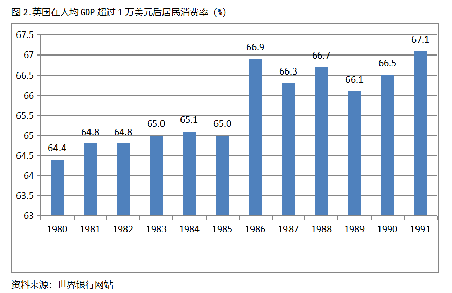 英國在人均GDP超過1萬美元后的12年期間,居民消費率一直保持在64.0%以上,同時也呈現(xiàn)出總體持續(xù)提高的趨勢。英國在1980年人均GDP超過1萬美元,當年居民消費率為64.4%,此后總體保持了持續(xù)提高的態(tài)勢,12年后的1991年提高到67.1%,提高了2.7個百分點。