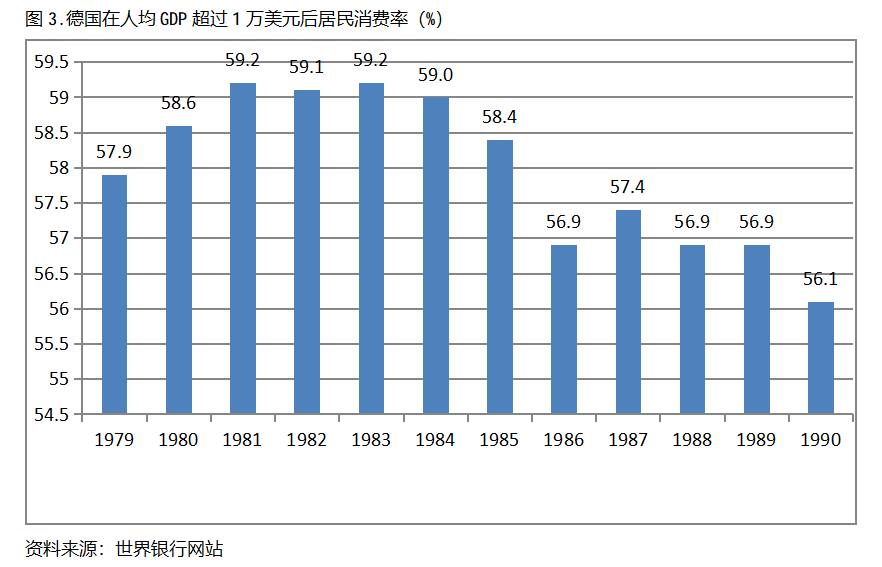 德國在人均GDP超過1萬美元后的12年期間,居民消費率一直保持在56.0%以上,同時還呈現(xiàn)出先提高后回落總體穩(wěn)定的趨勢。德國在1979年人均GDP超過1萬美元,當年居民消費率為57.9%,1981年提高到59.2%,隨后又有所回落,1990年為56.1%,也就是說,德國在人均GDP超過1萬美元后的12年期間,居民消費率由當年的57.9%提高到1981年最高的59.2%,共提高了1.3個百分點。