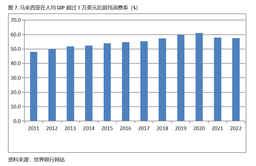 馬來西亞在人均GDP超過1萬美元后的12年期間,居民消費率基本上保持在50.0%以上,也呈現(xiàn)出較長時間的提高,但后幾年也出現(xiàn)小幅的回落。馬來西亞在2011年人均GDP超過1萬美元,當年居民消費率為48.0%,2020提高到61.0%,隨后出現(xiàn)回落,2022年為57.6%,也就是說,馬來西亞在人均GDP超過1萬美元后的12年期間,居民消費率由當年的48.0%提高到2020年最高的61.0%,共提高了13.0個百分點。